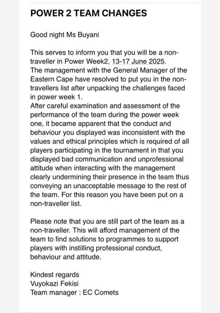 However, approximately eight days before the second Power Week, Nxele says she received a phone call from team manager Vuyokazi Fekisi requesting her email address. Later that evening, she received communication informing her that she would be listed as a non-travelling player.